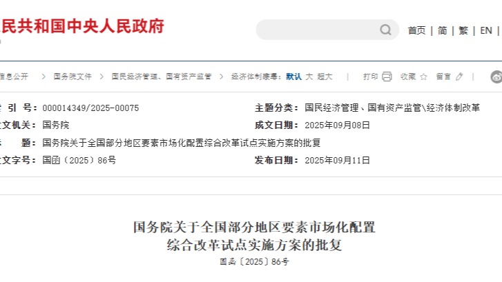国务院关于全国部分地区要素市场化配置综合改革试点实施方案的批复国函〔2025〕86号北京市、江苏省、浙江省、安徽省、福建省、河南省、湖南....